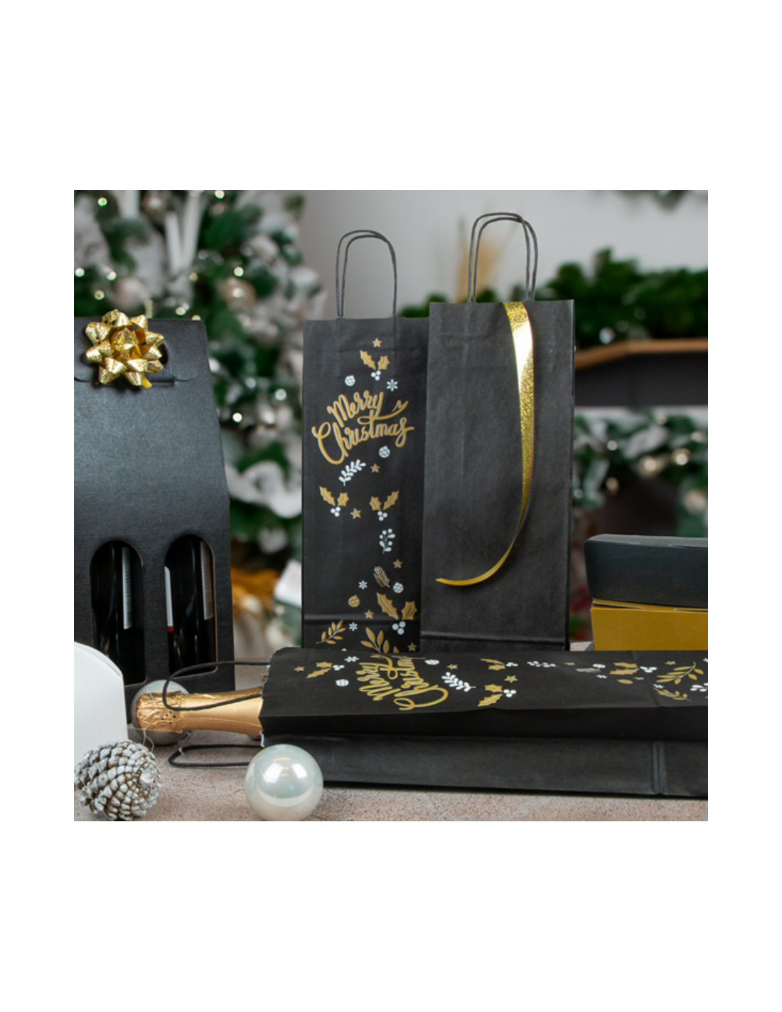 Kraft Wijntas 14+8x39cm voor 1 Fles Zwart "Merry Christmas"/ Flestas papier / Cadeauverpakking /draagtas voor Fles/wijn / Kerst