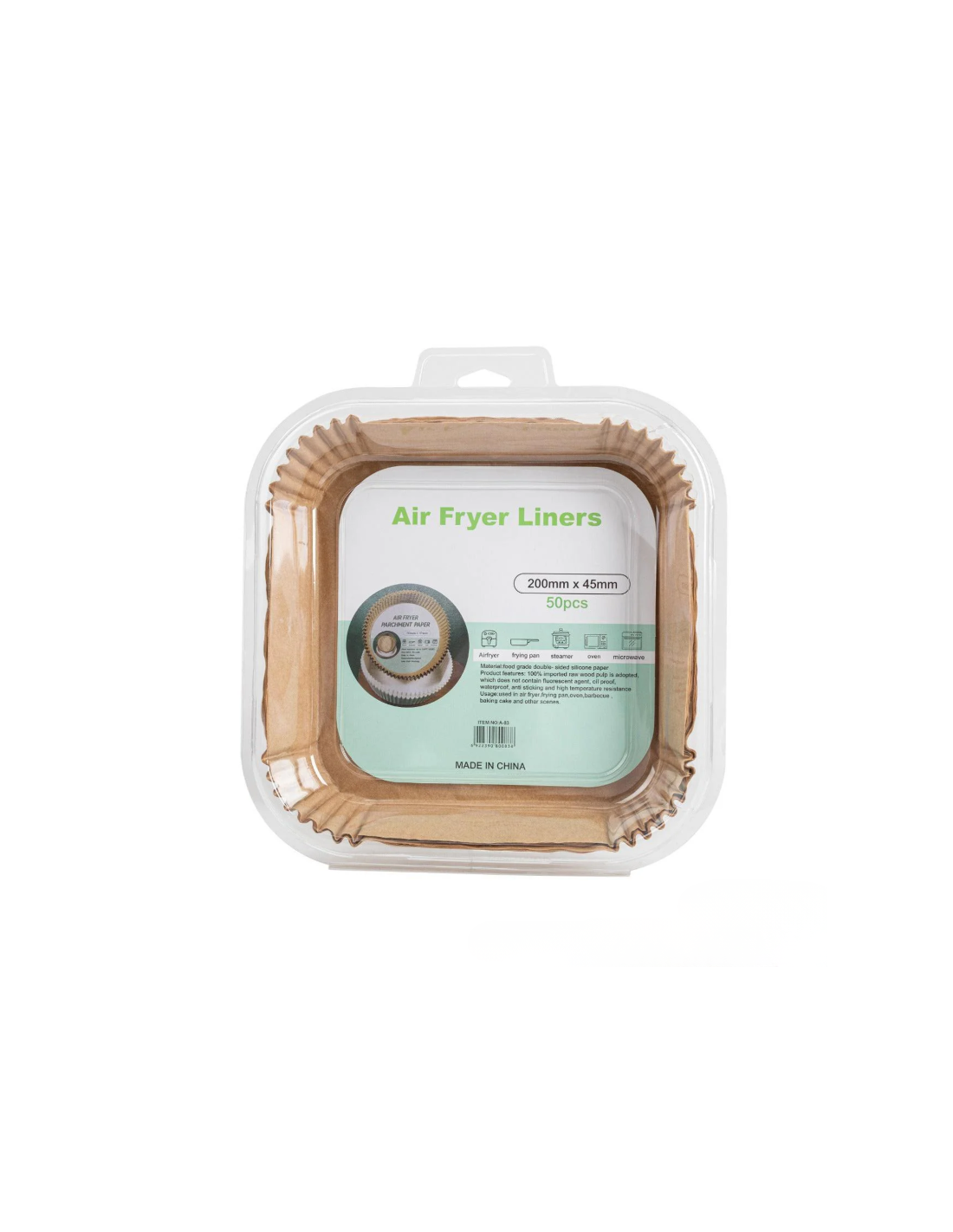 Deze vierkante wegwerpbakjes van bakpapier zijn speciaal ontwikkeld voor airfryers van maat XL en XXL. Met hun grote formaat van 200 mm x 45 mm voorkomen ze aankoeken van voedsel en houden ze het airfryer-mandje schoon. Hittebestendig, antikleef en eenvoudig weg te gooien na gebruik. Ideaal voor grote porties, dagelijks gebruik en professionele toepassingen. Verpakt per 50 stuks.