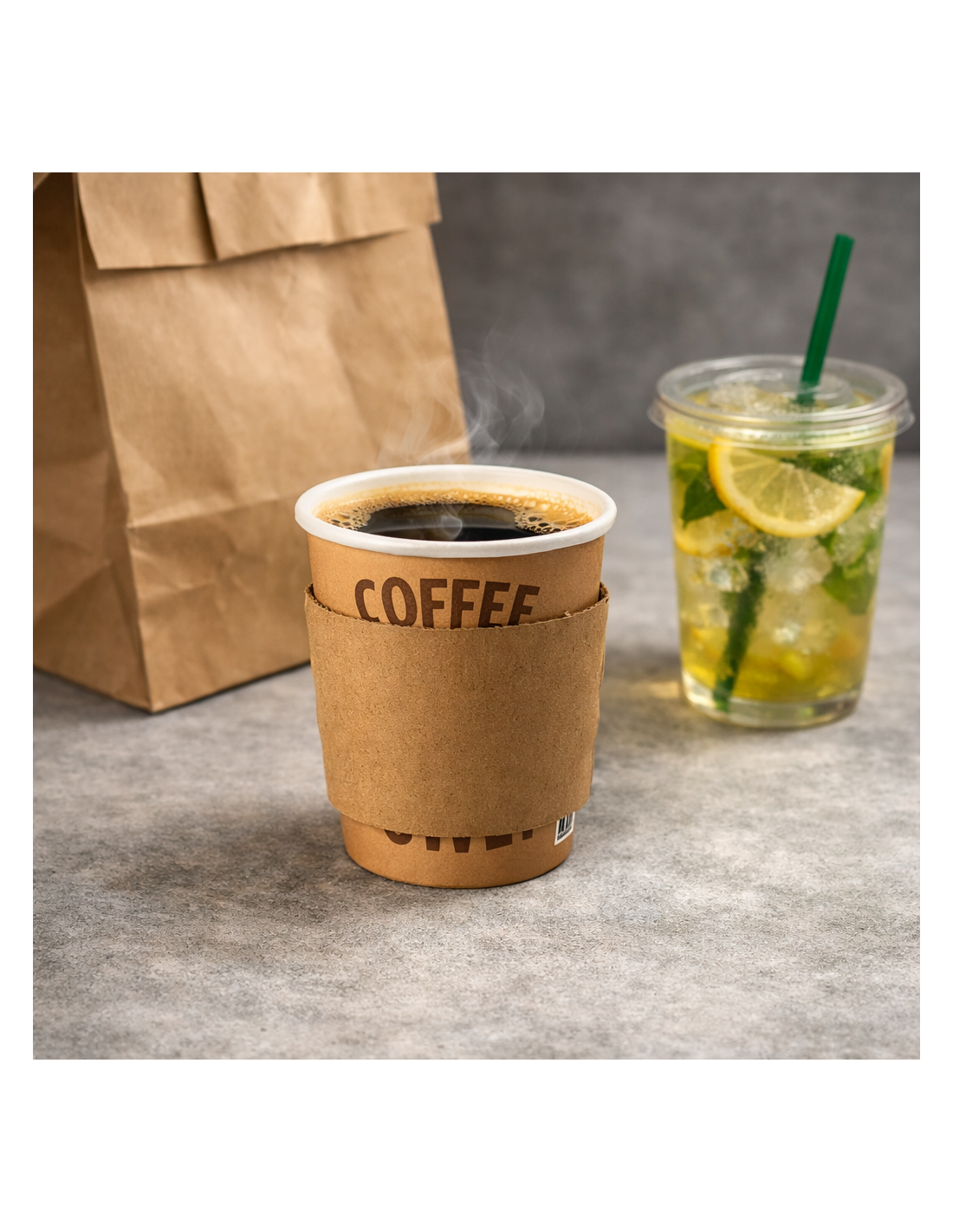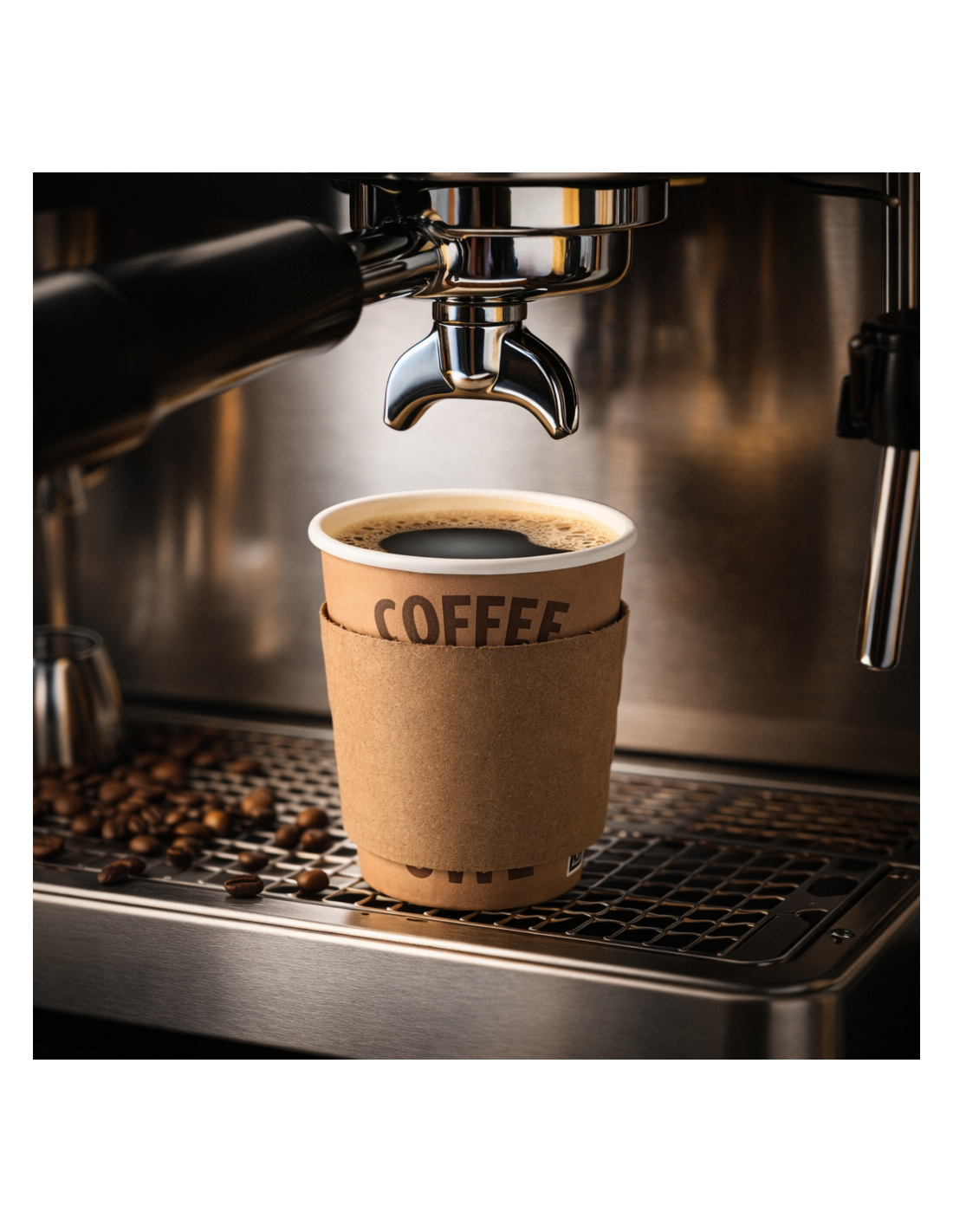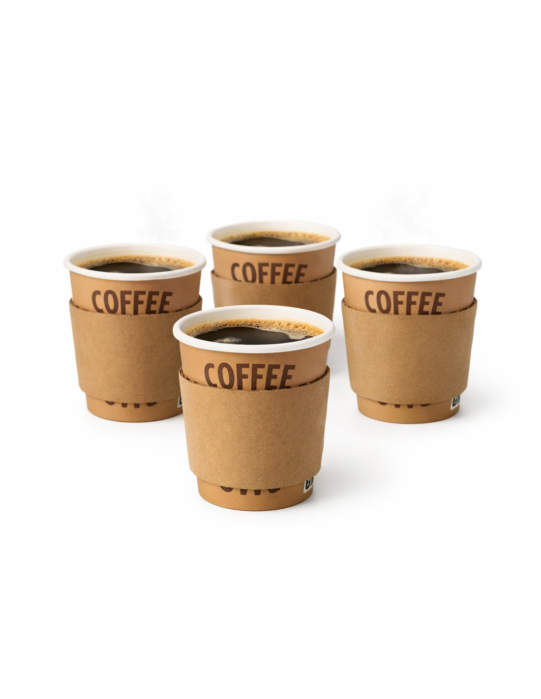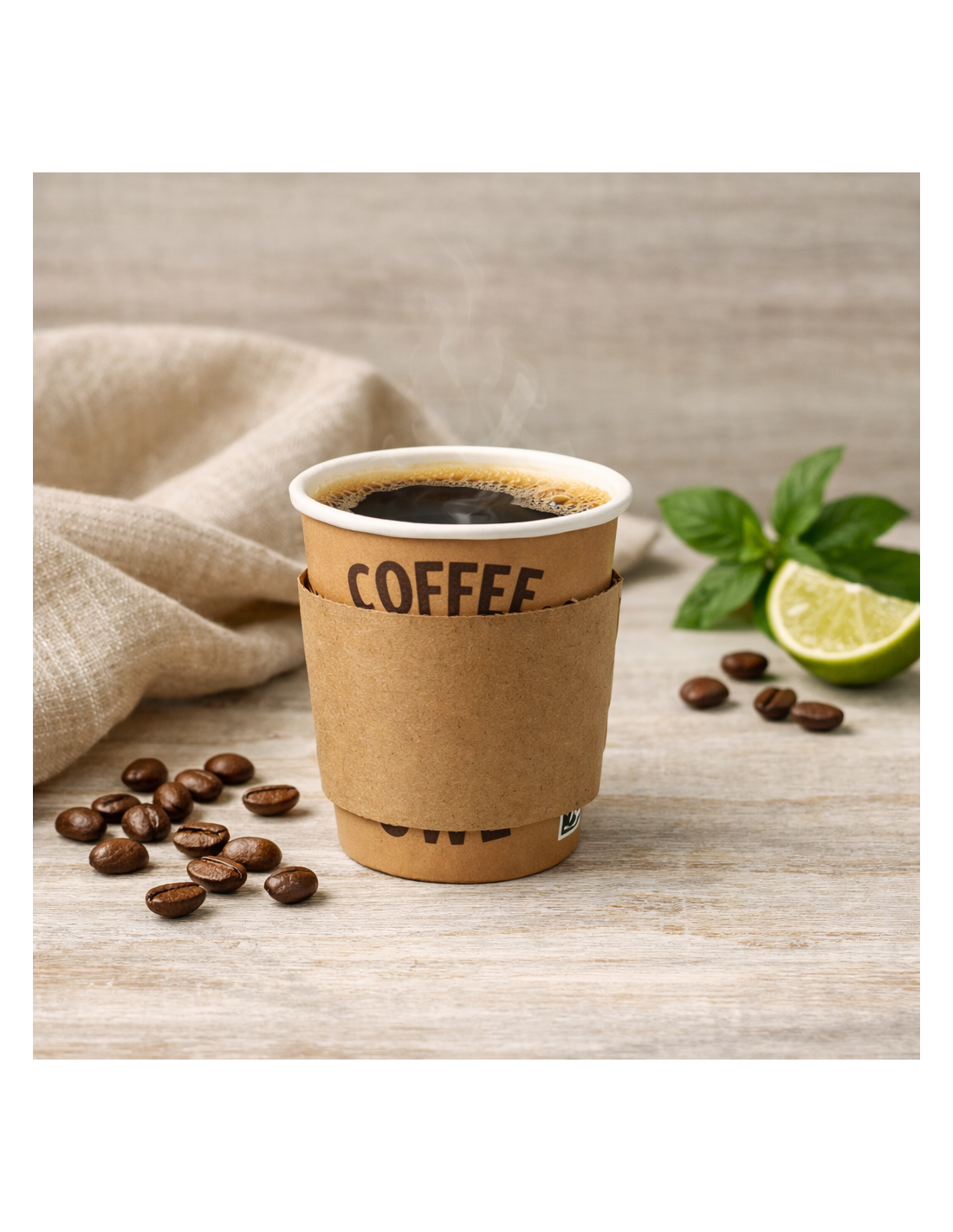 100 kartonnen sleeves voor koffiebekers van 230 cc / 8 oz. Ze beschermen de handen tegen warmte, verbeteren de grip en zijn ideaal voor cafés, coffee corners en takeaway.